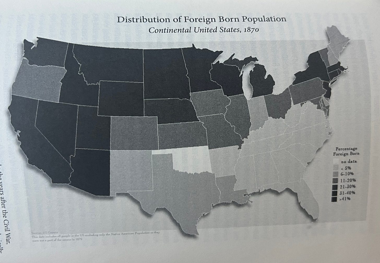 The first to arrive and supplement the sparse population of Indians and Hispanic “Californios” were not Americans but Mexicans, Chileans, Peruvians, Tasmanians, and native Hawaiians. Then came the hundreds of thousands of overland gold seekers from the east along the Oregon Trail, as well as by ship from France and China. After them came the Homestead Act and the transcontinental railroad, which brought not just more Americans but also English, Germans and Scandinavians to both California and the rest of the western states and territories. By 1870, New York, the state with the highest percentage of foreign-born residents on the eastern seaboard, ranked only ninth when you factored in the West. Ahead of it were Arizona, Idaho, Nevada, Wyoming, Montana, California, Utah, and Dakota. “The percentage of immigrants in five Idaho mining towns (68.1 percent),” writes West, “was nearly twice that of Boston and Brooklyn (35.1 percent and 36.5 percent).” San Francisco had the largest per-capita foreign born population of any city in the country.